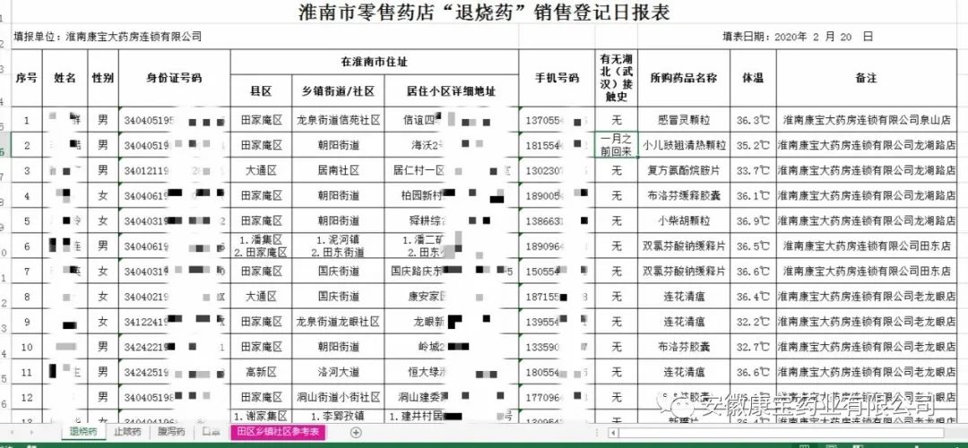 自2月5日起,質管部每日協助康寶各門店對“退燒藥、止咳藥、腹瀉藥、口罩”的銷售情況實行登記報告,詳細登記購買人的身份信息、居住地址、聯系方式、有無湖北(武漢)接觸史等,協助淮南市疫情防控中心開展新冠肺炎疫情的全面排查和精準摸排,為全市疫情防控工作提供了重要的信息支持。